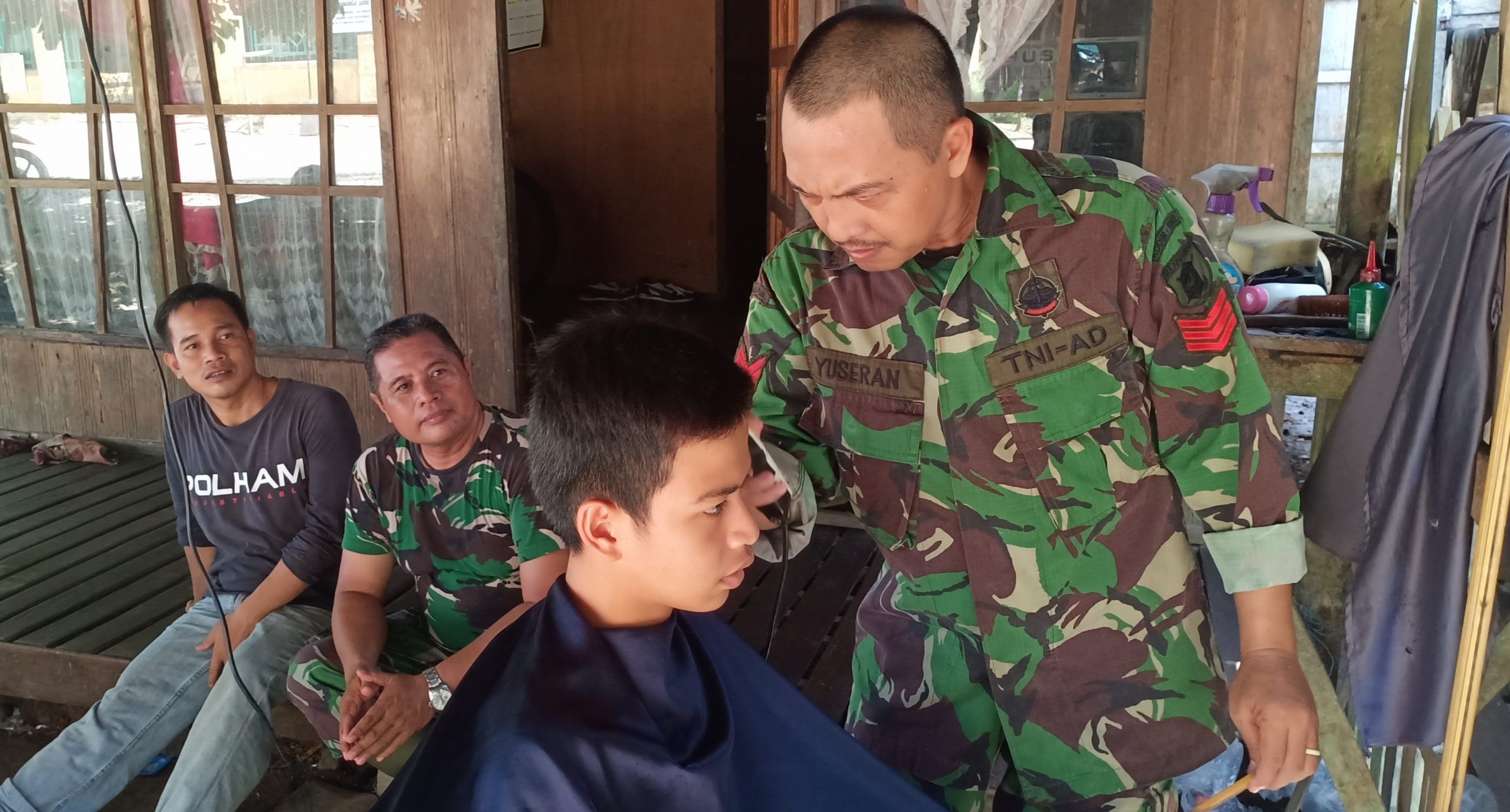 BARABAI – Satgas TNI Manunggal Membangun Desa (TMMD) ke-107 tahun 2020 Kodim 1002/Barabai melakukan pangkas rambut gratis desa Sungai Jaranih kecamatan Labuan Amas Selatan