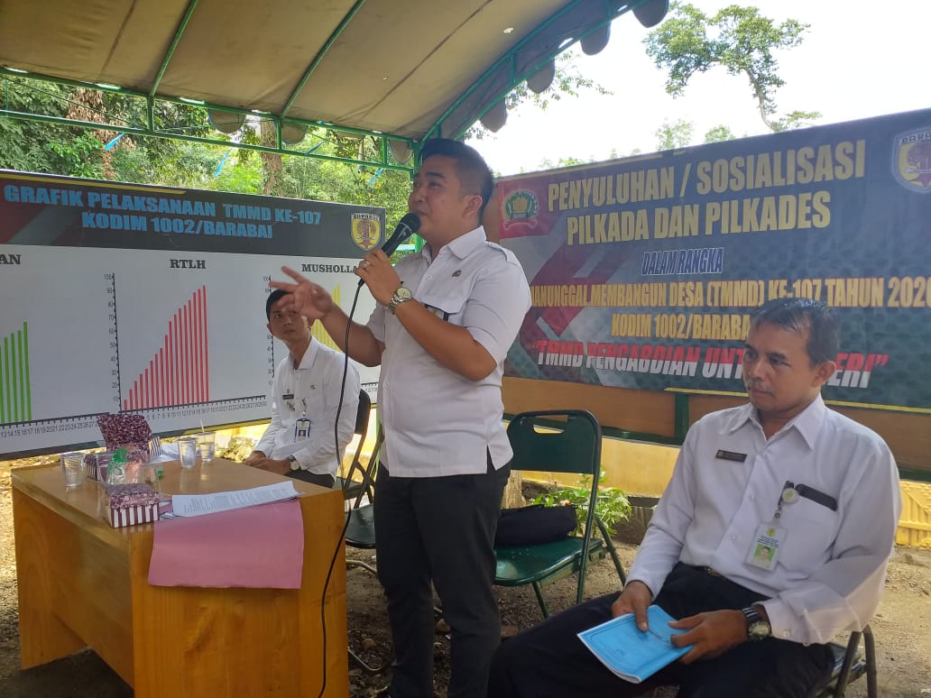 BARABAI – Satgas TMMD ke-107 tahun 2020 Kodim 1002/Barabai menggandeng Dinas PMD (Pemerintahan Masyarakat Desa) Kabupaten Hulu Sungai Tengah untuk memberikan penyuluhan Pilkades (Pemilihan