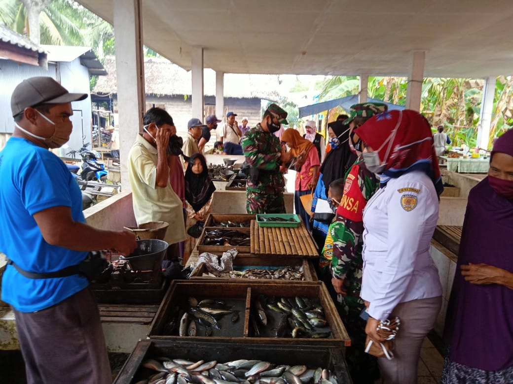 BARABAI, Danramil 1002-01/Birayang Kapten Inf Subhan bersama Forkopicam Batang Alai Selatan mendampingi Bupati Hulu Sungai Tengah H.A.Chairansyah pantau pelaksanaan pendisplinan protokol kesehatan di pasar