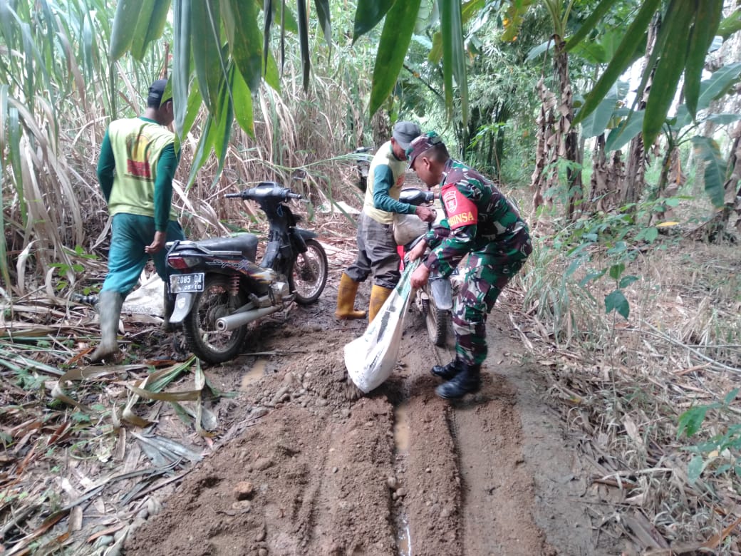 BARABAI-Serka Suyanto Babinsa Koramil 1002-05/Pandawan melaksanakan kegiatan gotong royong penimbunan Jalan Usaha Tani (JUT) bersama warga Kambat Utara Kecamatan Pandawan Kabupaten Hulu Sungai Tengah
