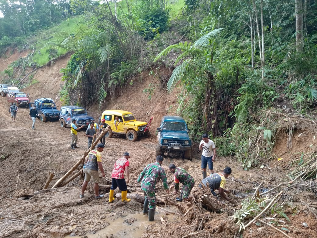 BARABAI-Kompak dan penuh semangat Babinsa Koramil 1002-07/Pagat Kodim 1002//Barabai Serda Embran Hartono dan Serda Sapto buka jalan untuk pendorongan logistik ke desa Datar