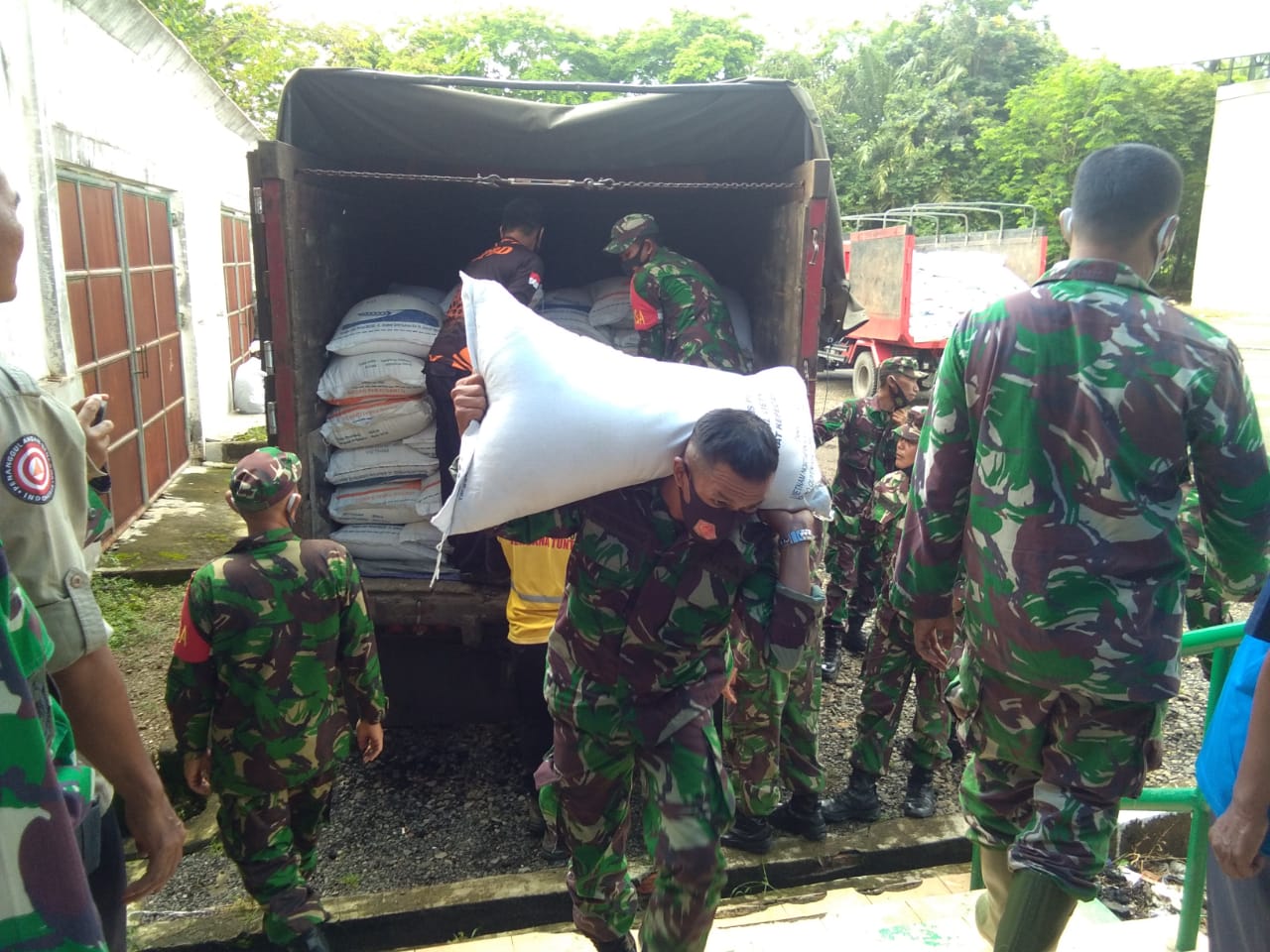Korem Antasari. 20 Ton Beras Bantuan Provinsi Kaltim Diturunkan Anggota Kodim 1002/Barabai
