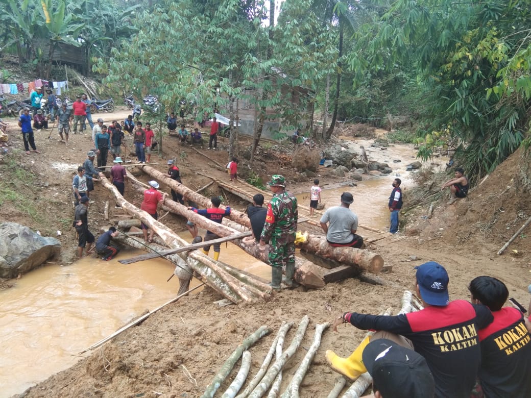 BARABAI-Babinsa Koramil 1002-07/Pagat Sertu Sanu bersama relawan dan warga masyarakat membuat jembatan darurat untuk membuka akses jalan yang terputus akibat musibah banjir dan