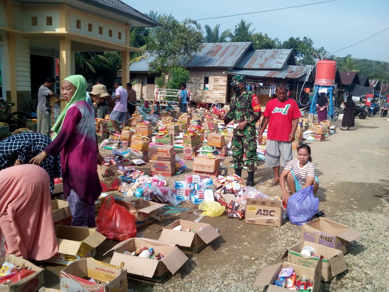 BARABAI-Babinsa Kodim 1002/Barabai dari Koramil 1002-07/Pagat Sertu Lukman Sakir membantu penyaluran logistik kepada warga korban Ben can a di desa Bari-Waki kecamatan Batu