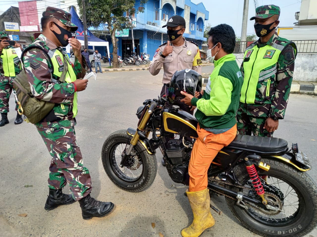 BARABAI-Tak Kendor, TNI-Polri dari Kodim 1002/Barabai dan Polres HST melaksanakan penegakkan disiplin protokol kesehatan kepada masyarakat Barabai.Minggu (28/02). Meski hari libur Babinsa Kodim