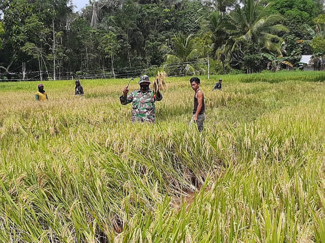 BARABAI-Dalam rangka mendukung program ketahanan pangan Babinsa Kodim 1002/Barabai terus berupaya mendampingi para petanidan membantu panen padi. Seperti yang dilakukan oleh Koptu Samsuhadi Babinsa