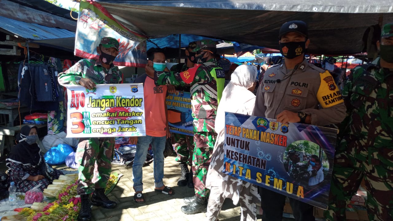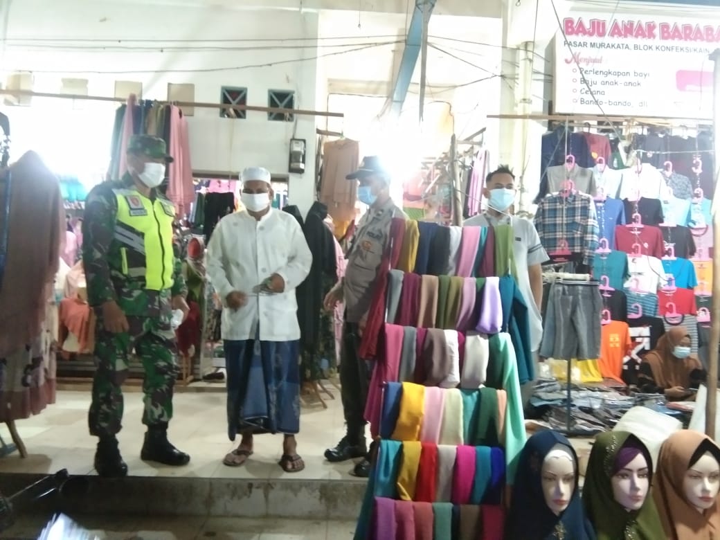 BARABAI-Petugas gabungan yang terdiri dari Kodim 1002/Barabai, Polres HST Serta Satpol PP menggelar Operasi penerapan Protokol Kesehatan (prokes) di komplek pasar Murakata Barabai.