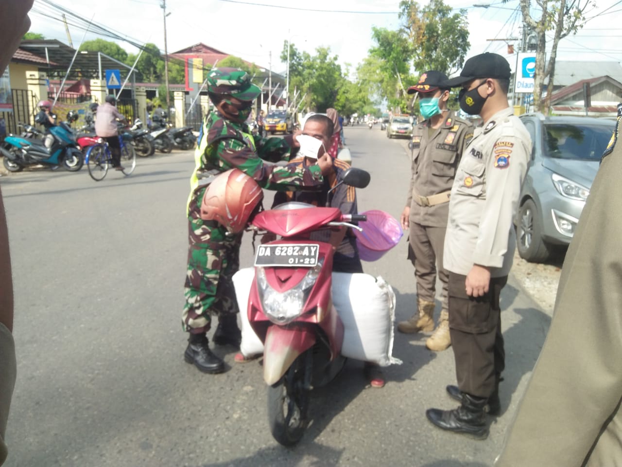 BARABAI-Petugas gabungan yang terdiri dari Kodim 1002/Barabai, Polres HST Serta Satpol PP menggelar Operasi penerapan Protokol Kesehatan (prokes) di Simpang Empat Gedung Murakata Barabai