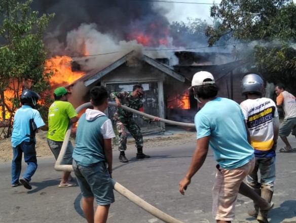 BARABAI-Babinsa Koramil 1002-01/Birayang Sertu Agus Rohmad dan Serda Mardiyanto bersama Tim BPK Balakar 654 Murakata dan warga berjibaku padamkan api kebakaran rumah. Kebakaran