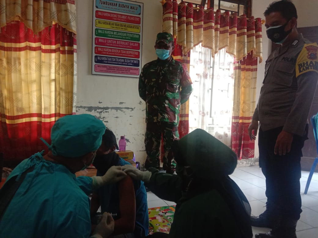 BARABAI-Babinsa Kodim 1002/Hulu Sungai Tengah bersama Bhabinkamtibmas dan aparat terkait melakukan pendampingan vaksinasi di wilayah binaan. Seperti yang dilakukan oleh Babinsa Koramil 1002-01/Batang Alai