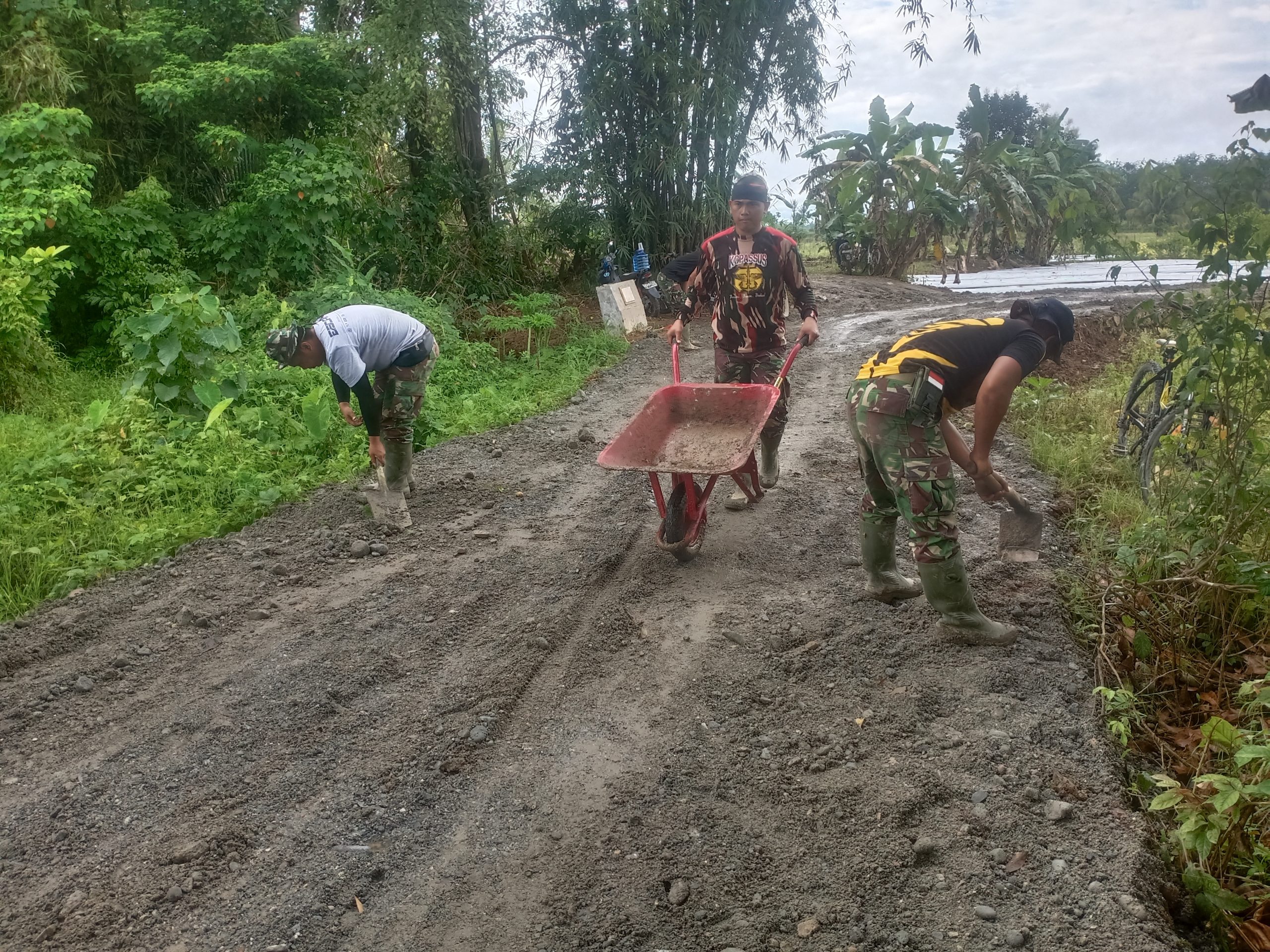 HULU SUNGAI TENGAH-Meski kondisi cuaca tidak mendukung, tak mengurangi semangat anggota Satgas TMMD ke 112 Kodim 1002/Hulu Sungai Tengah (HST) untuk bekerja melanjutkan perbaikan