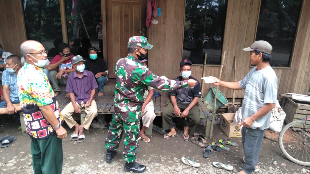 HULU SUNGAI TENGAH- Anggota satgas TMMD ke-112 Kodim 1002/Hulu Sungai Tengah (HST) melakukan sosialisasi sekaligus membagikan masker secara gratis. Sosialisasi dan pembagian masker ini