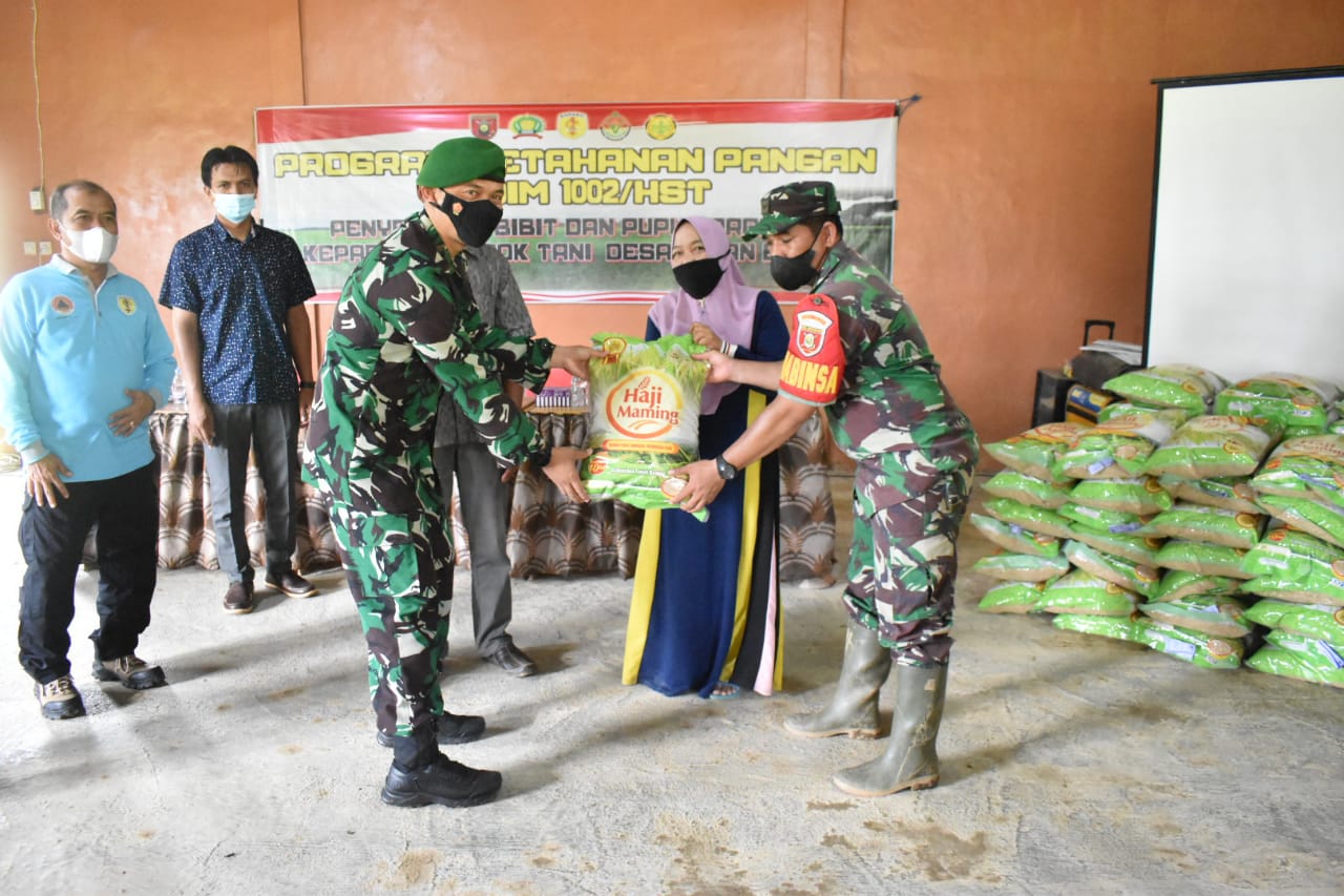 BARABAI-Tindak lanjut Program Ketahanan Pangan, Komandan Kodim 1002/HST Letkol Kav Gagang Prawardhana menyerahkan bantuan bibit padi dan pupuk organik kepada petani. Penyerahan dilakukan di