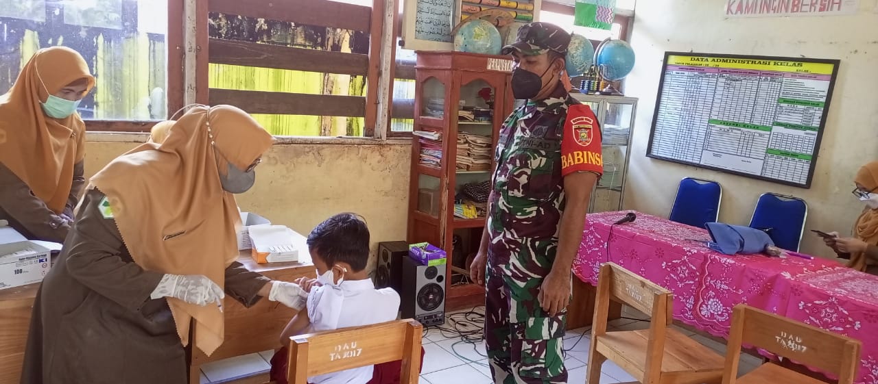BARABAI-Babinsa di jajaran Komando Distrik Militer (Kodim) 1002/HST bersama Bahbinkamtibmas gencar memberikan pendampingan vaksinasi anak usia 6-11 tahun di wilayah binaan masing-masing. Seperti dilakukan