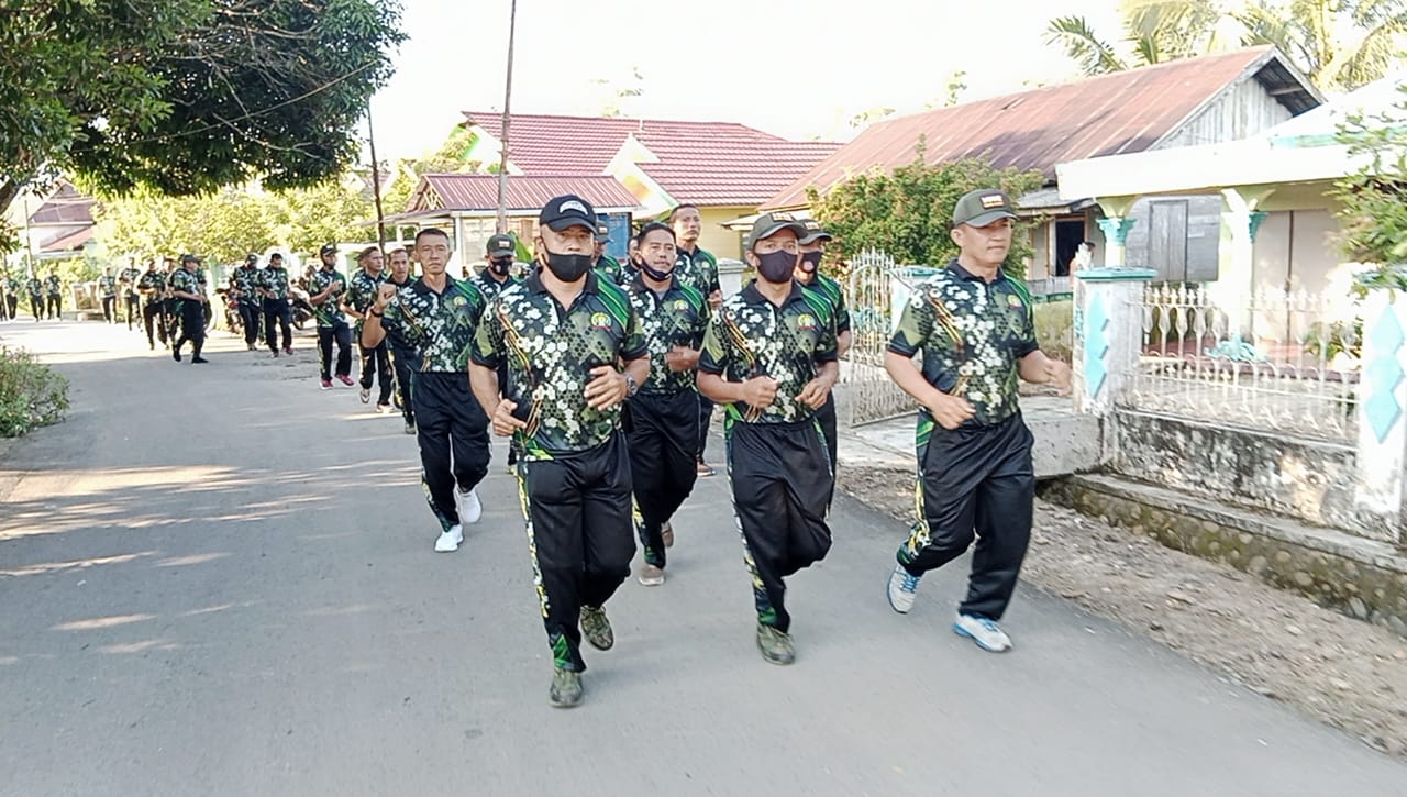 BARABAI-Bina kebugaran badan, anggota Kodim 1002/HST melaksanakan lari jalanan dipimpin langsung oleh Plh.PasiOpsdim 1002/HST Kapten Inf Anda Tiro. Kegiatan diawali apel pagi melanjutkan dengan