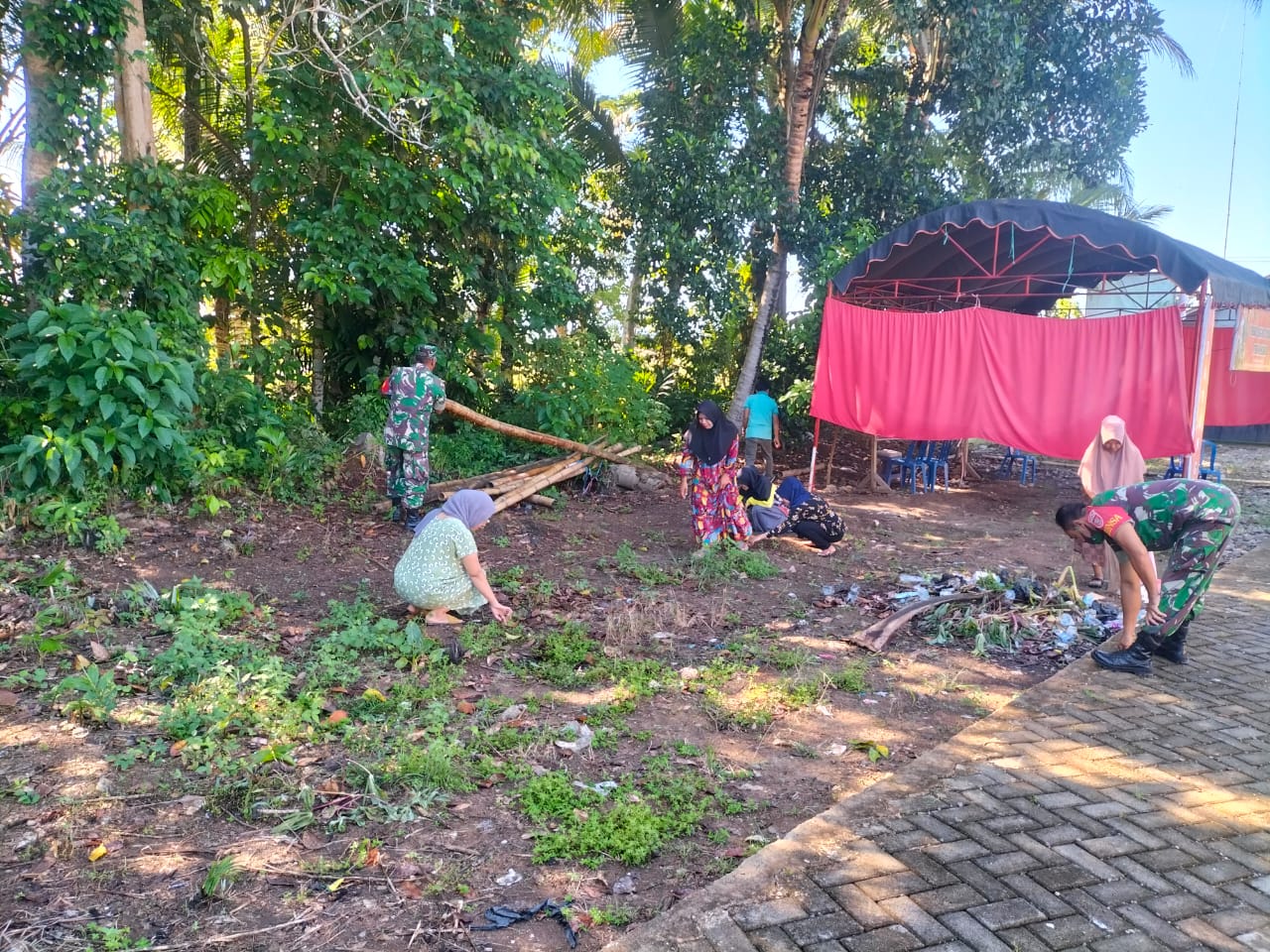 BARABAI-Anggota Koramil 1002-05/Pandawan bersama warga melaksanakan Pembersihan (Pembuatan Tanaman Toga) dengan Kader Posyandu dan pemasangan Tenda dalam rangka penilaian Lomba Desa di Kampung Pancasila