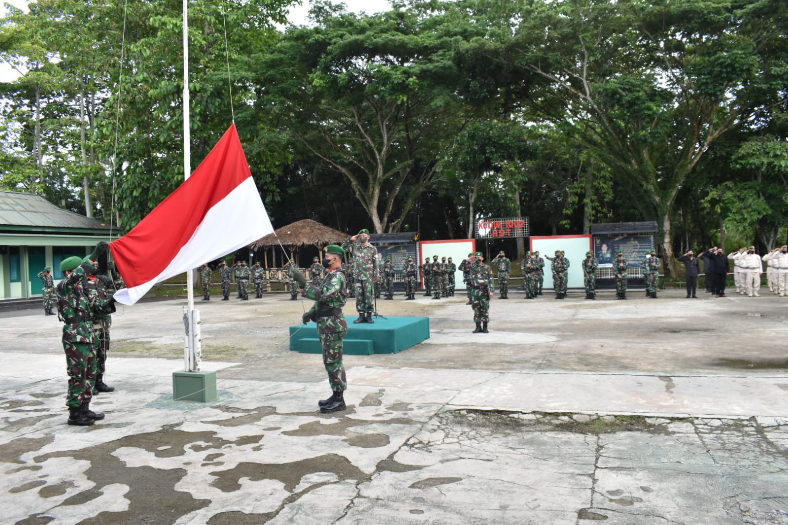 BARABAI-Seluruh anggota dan PNS KOdim 1002/HST mengikuti Upacara Pengibaran Bendera Merah Putih 17-an bertempat di lapangan Makodim Jl. Telaga Padawangan Kelurahan Barabai Timur Kecamatan