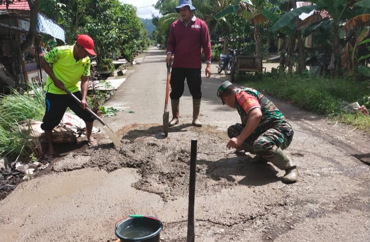 Serda Yunus Suyanto bersama Aparat Desa Tabat Padang Perbaiki Jalan Rusak