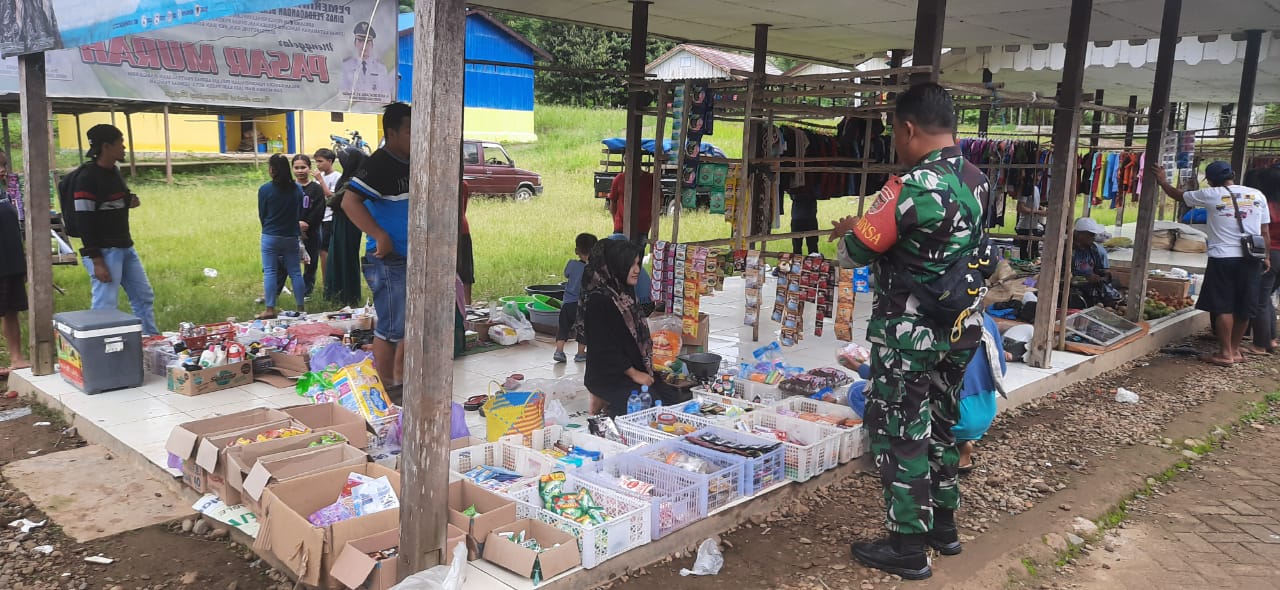 BARABAI-Babinsa Koramil 1002-01/Batang Alai Selatan Serda Rahmad Zubair melaksanakan monitoring dan pengecekan ketersediaan dan harga bahan pokok (Sembako) di pasar mingguan desa Hinas Kiri
