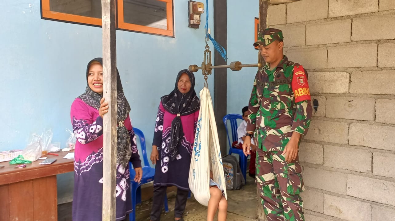 BARABAI-Dalam rangka program balita sehat, Babinsa Kodim 1002/Hulu Sungai Tengah melaksanakan pendampingan kegiatan Posyandu dan PMT (Pemberian Makanan Tambahan) Balita yang terindikasi Stunting. Hal