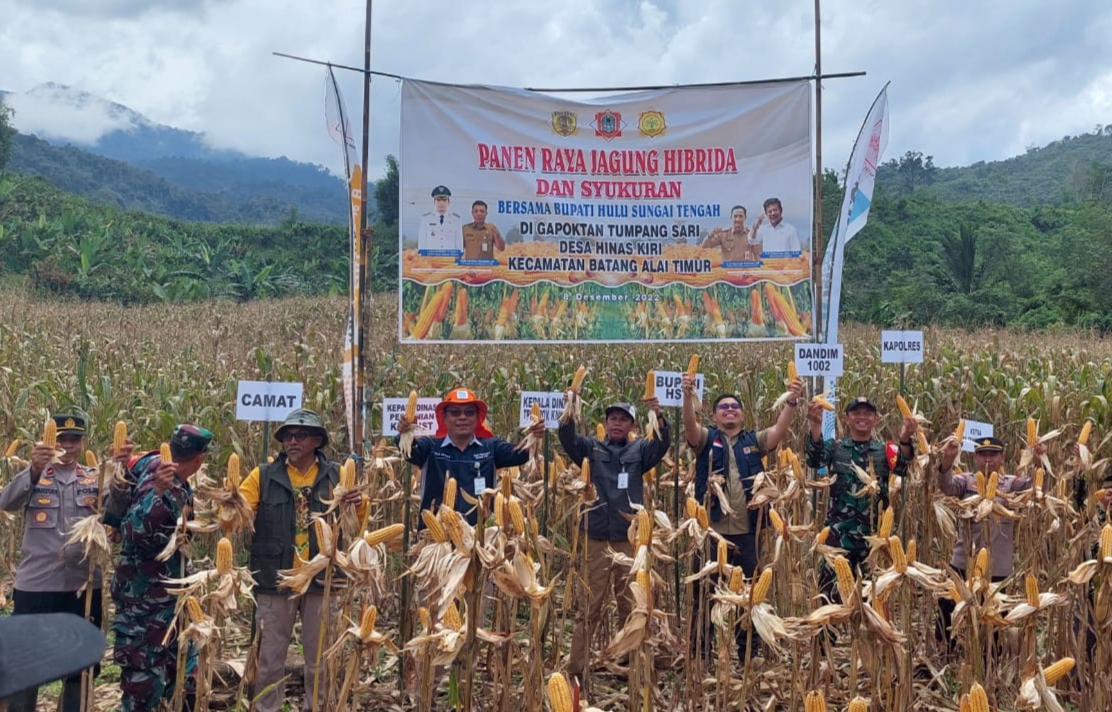 BARABAI-Bupati HST H.Aulia Oktafiandi ST.M.AppCom bersama Dandim 1002/Hulu Sungai Tengah Letkol Kav Gagang Prawardhana.S.I.P.,M.Han melaksanakan panen raya jagung Pakan di desa Hinas Kiri Kecamatan