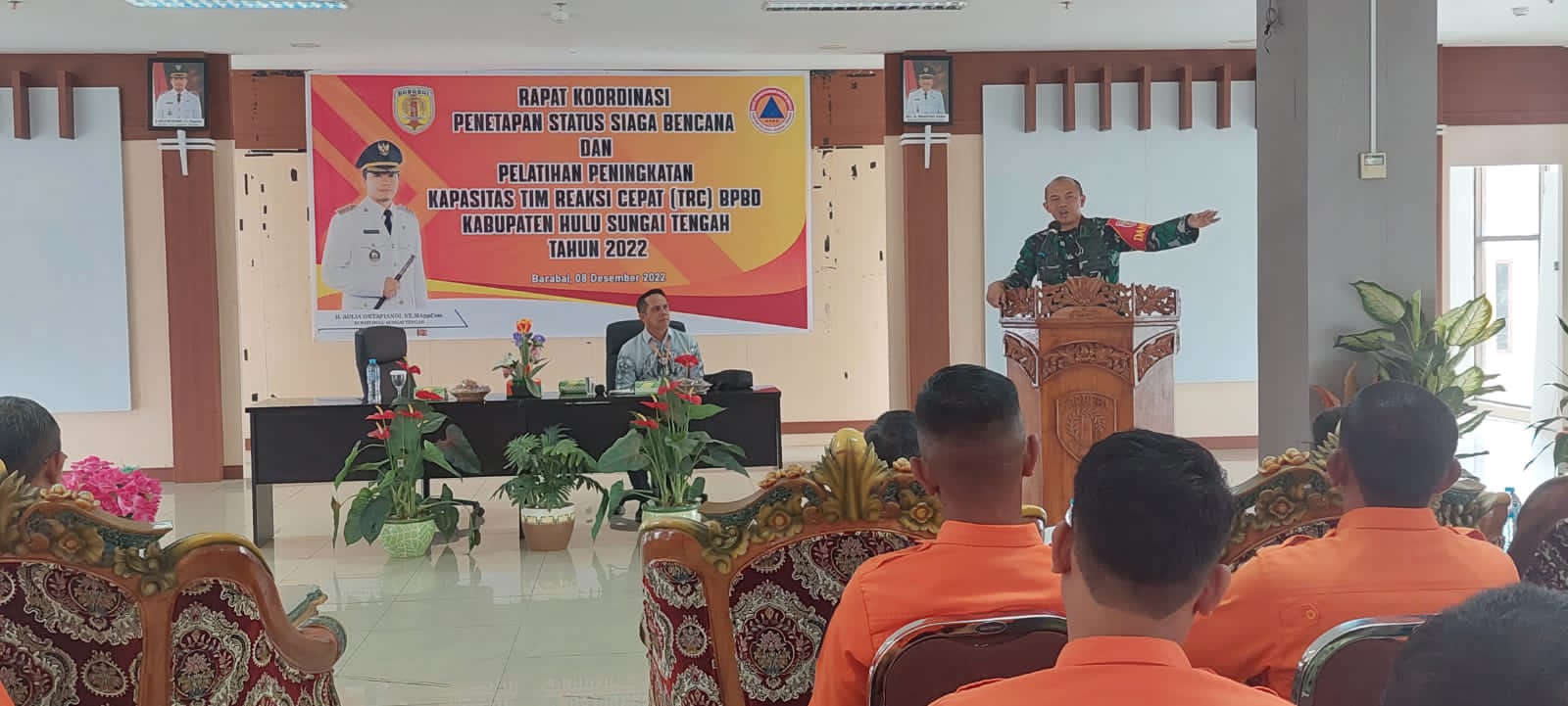 BARABAI-Komandan Kodim 1002/Hulu Sungai Tengah Letkol Kav Gagang Prawardhana.S.I.P.,M.Han memberikan pembekalan dalam rangkaian kegiatan Rapat Koordinasi Penetapan Status Bencana Hidrometeorologi Tahun 2022 sekaligus Pembukaan
