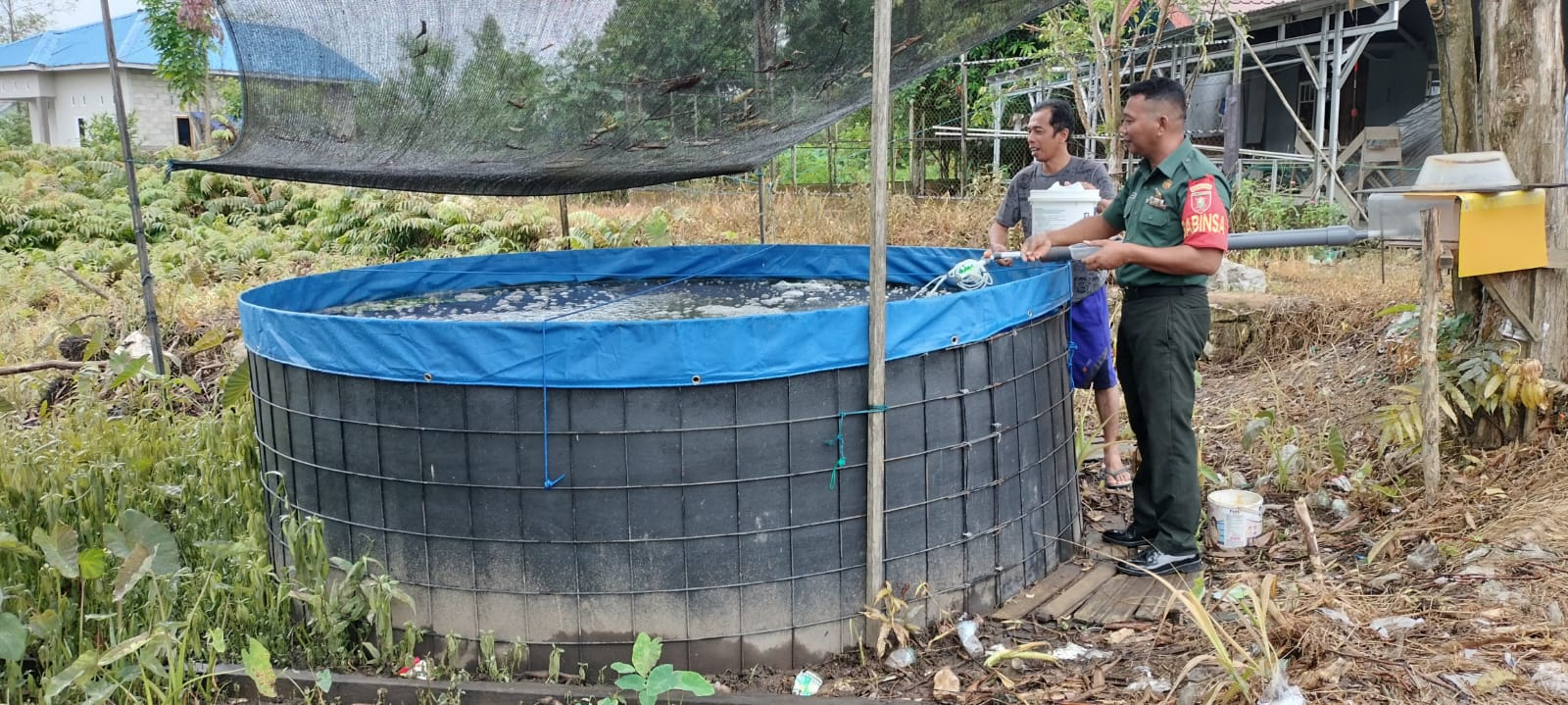 BARABAI-Jalin Silaturahmi melalui Komunikasi Sosial, Babinsa Koramil 1002/Barabai Kodim 1002/Hulu Sungai Tengah, Sertu Mulyadi melaksanakan monitoring ketahanan pangan peternak ikan lele dengan media bioflok.