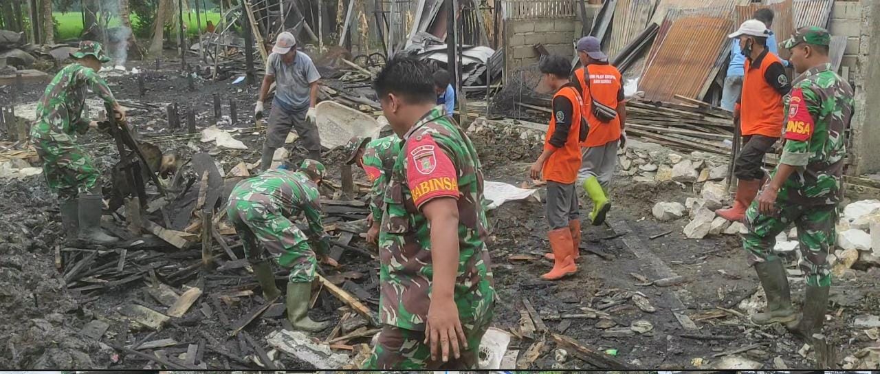 BARABAI-Koramil 1002-06/Barabai bersama BPBD Kab. HST, Dinas Lingkungan Hidup dan Barisan Kebakaran serta warga masyarakat melaksanakan gotong royong pembersihan puing-puing sisa kebakaran 3 unit