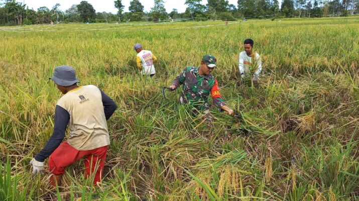 BARABAI-Dalam rangka mendukung Program Pemerintah dalam hal ini Ketahanan Pangan, Serda Duwi Andarwani Babinsa Koramil 1002-06/Barabai bantu warga binaan panen Padi di desa Kayu
