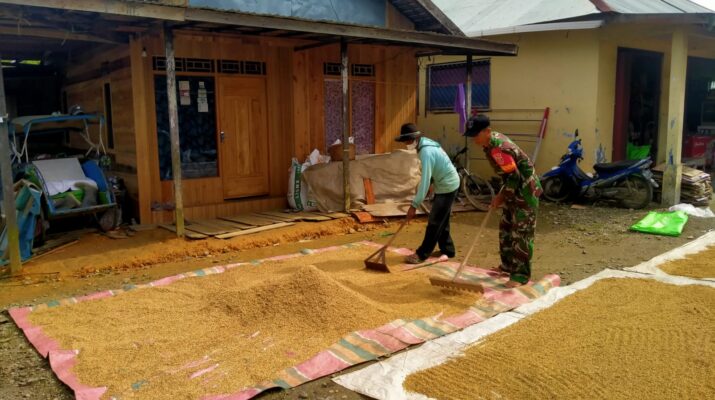 Sambangi Desa Binaan, Koptu Husairi Babinsa Koramil 1002-06/Barabai Bantu Warga Jemur Padi
