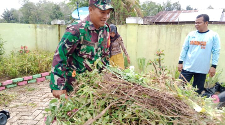 BARABAI-Sebagai upaya menciptakan lingkungan yang bersih dan sehat, Serka Yulianto Babinsa Koramil 1002-02/Batang Alai Utara bersama aparat desa melaksanakan pembersihan lingkungan kantor Desa Karau
