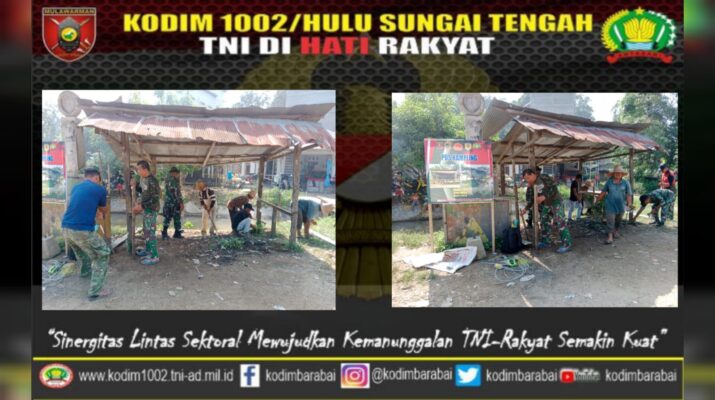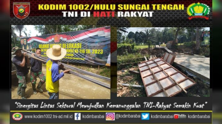BARABAI-Anggota TNI dari Satgas TMMD ke-116 Kodim 1002/HST bersama warga desa Hapulang kecamatan Haruyan Kabupaten Hulu Sungai Tengah bongkar pos kampling. Senin (22/05/2023). Sore