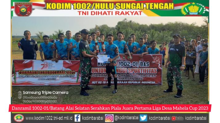 BARABAI-Danramil 1002-01/Batang Alai Selatan Kapten Inf Moh. Alip Suroso menutup secara resmi turnamen sepakbola Liga Desa Mahela Cup 2023 dalam rangka memeriahkan HUT ke-78