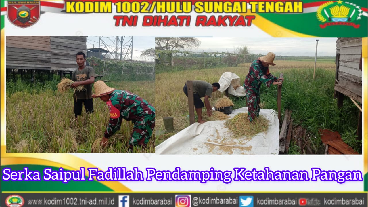 BARABAI-Dalam rangka mendukung program pemerintah terkait ketahanan pangan Babinsa jajaran Kodim 1002/HST melaksanakan pendampingan penen padi warga binaan. Seperti yang dilakukan oleh Serka Saipul