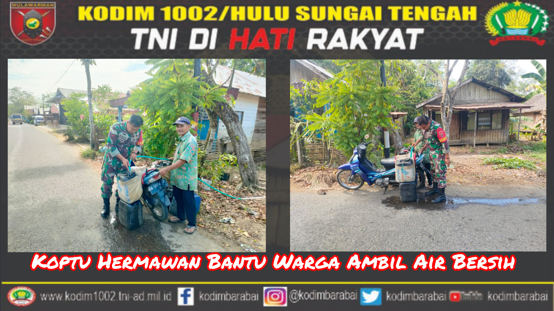 BARABAI-Babinsa Koramil 1002-08/Labuan Amas Utara Koptu Hermawan membantu warga masyarakat pengambilan air bersih di Desa mantaas RT 03 Kecamatan Labuan Amas Utara Kab. Hulu
