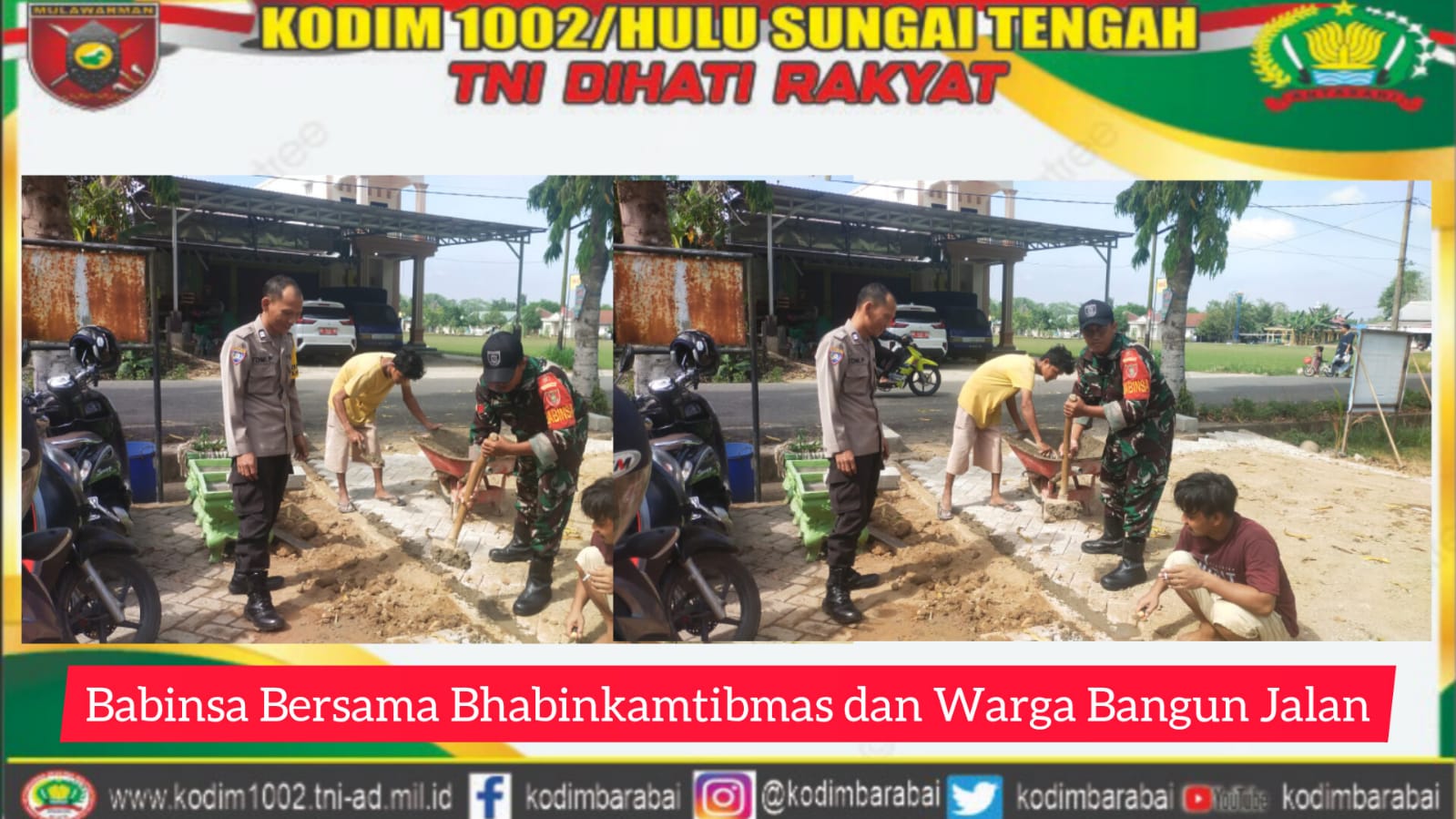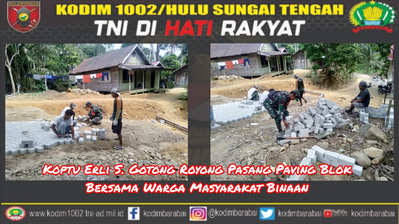 BARABAI – Babinsa Desa Hinas Kiri, Koptu Erli Sepriyanto bersama warga gotong-royong membangun jalan menggunakan paving block di Desa Hinas Kiri, Kabupaten Hulu Sungai