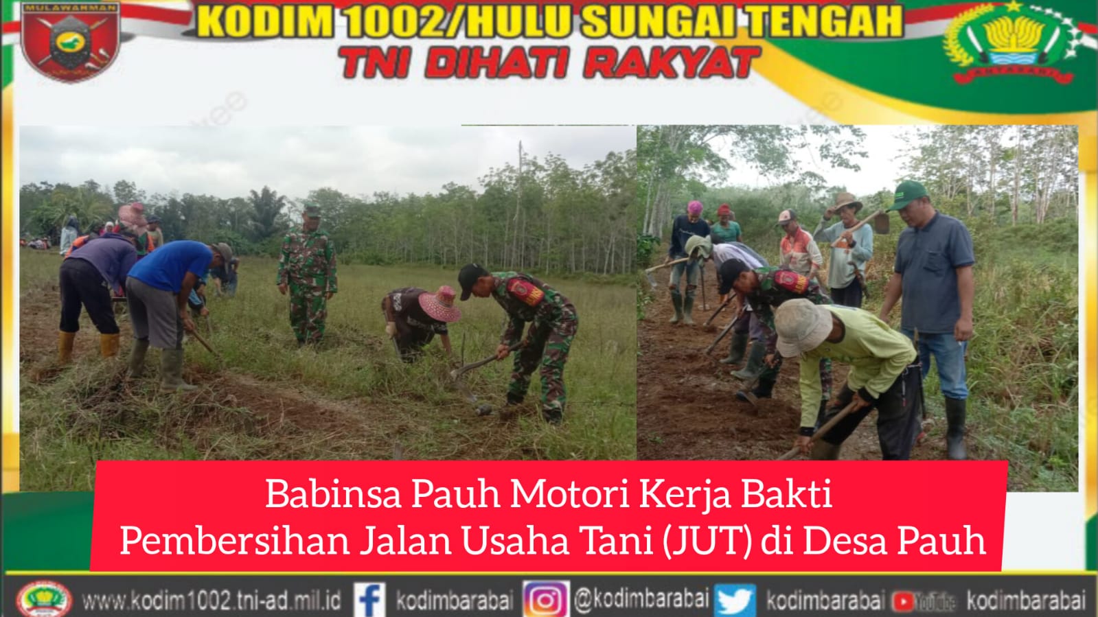 BARABAI-Babinsa Koramil 1002-02/Batang Alai Utara Serda Edi Karyadi bersama warga desa Pauh Kecamatan Limpaso Kab. Hulu Sungai Tengah melaksanakan Gotong pembersihan Jalan Usaha Tani