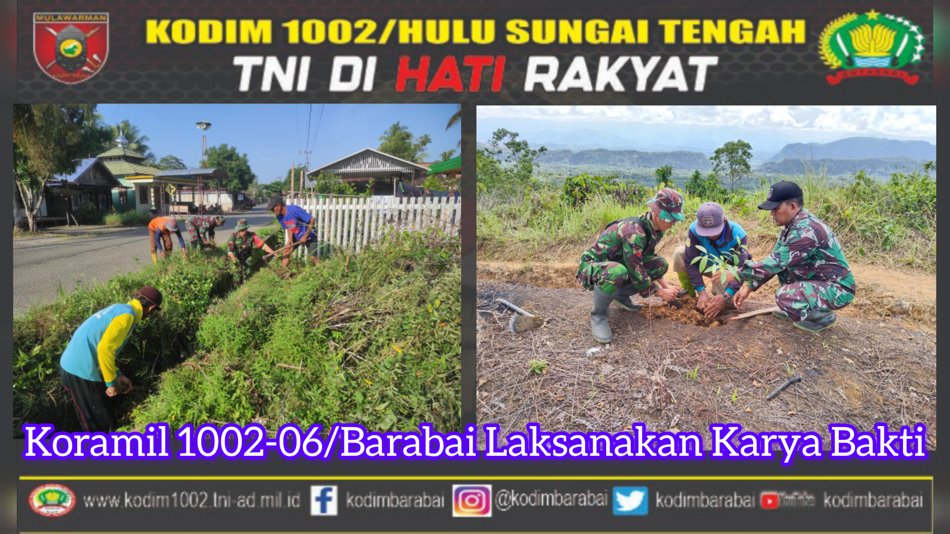 BARABAI-Bersih-bersih selokan, pasar, dan lingkungan sekitar dan Tanam Pohon menjadi sasaran Karya Bakti dalam rangka antisipasi bahaya banjir serta wabah penyakit di wilayah Koramil