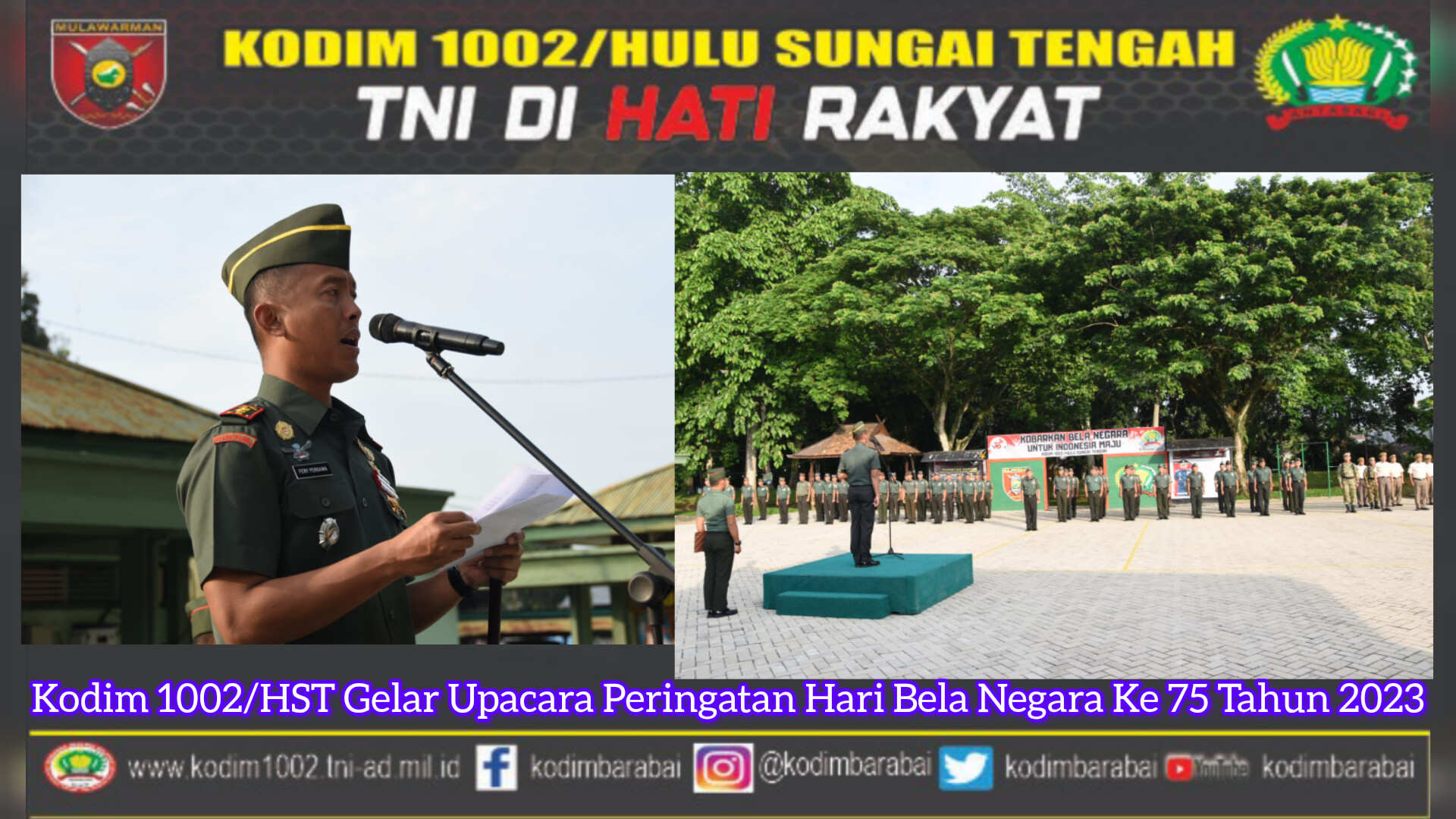 BARABAI-Kodim 1002/Hulu Sungai Tengah menggelar upacara Peringatan Hari Bela Negara ke-75 Tahun 2023 bertempat dilapangan Apel Makodim Jalan Telaga Padawangan Kel. Barabai Timur Kec.