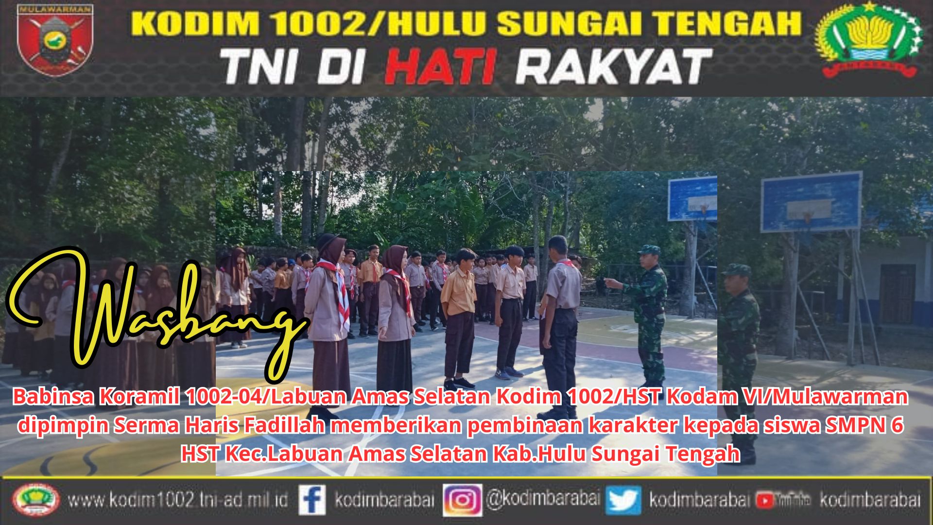BARABAI-Babinsa Koramil 1002-04/Labuan Amas Selatan Kodim 1002/HST Kodam VI/Mulawarman dipimpin Serma Haris Fadillah memberikan pembinaan karakter kepada siswa SMPN 6 HST Kec.Labuan Amas Selatan