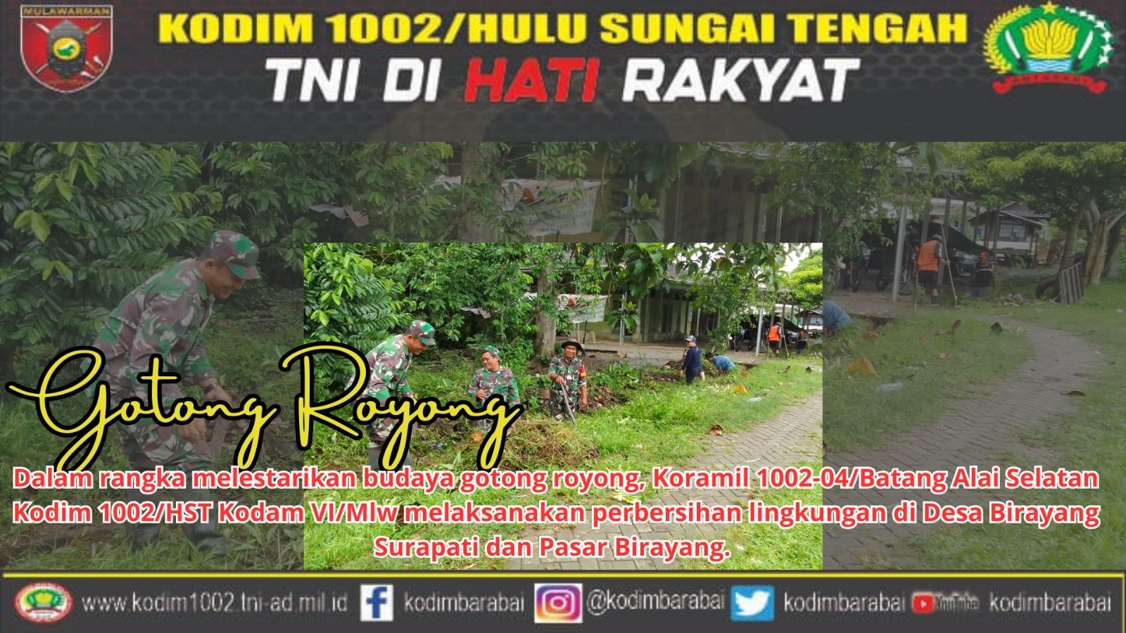 Barabai-Dalam rangka melestarikan budaya gotong royong, Danramil 1002-04/Batang Alai Selatan Kodim 1002/HST Kodam VI/Mlw, Kapten Inf Moh. Alip Suroso, mengajak masyarakat melaksanakan pembersihan di