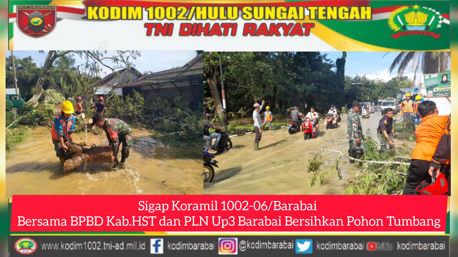 Sigap Koramil 1002-06/Barabai Bersama BPBD Kab.HST dan PLN Up3 Barabai Bersihkan Pohon Tumbang