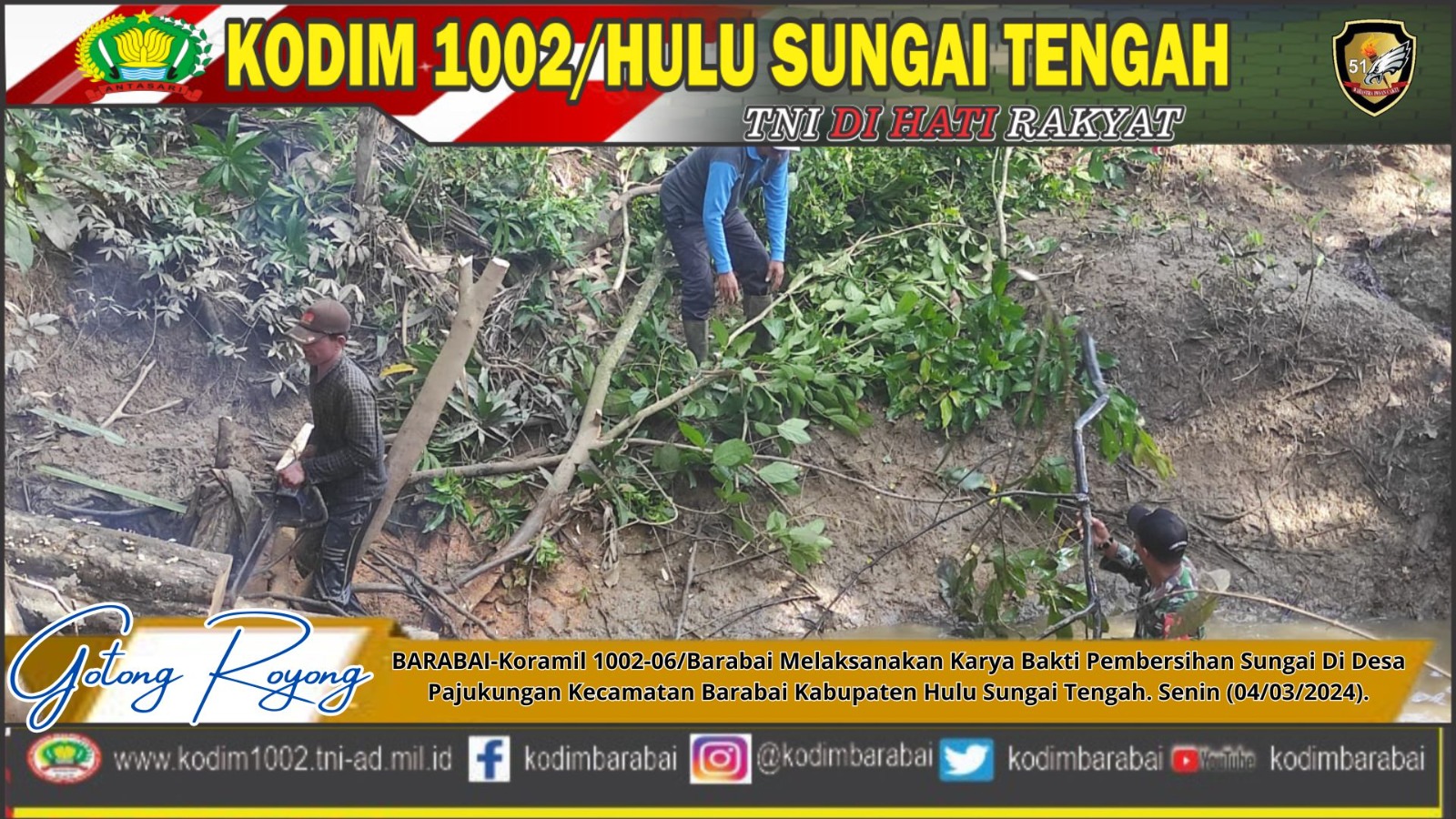 BARABAI-Koramil 1002-06/Barabai melaksanakan gotong royong bersama warga masyarakat normalisasi sungai di Desa Pajukungan Kecamatan Barabai Kabupaten Hulu Sungai Tengah. Senin (04/03/2024) Gotong royong normalisasi