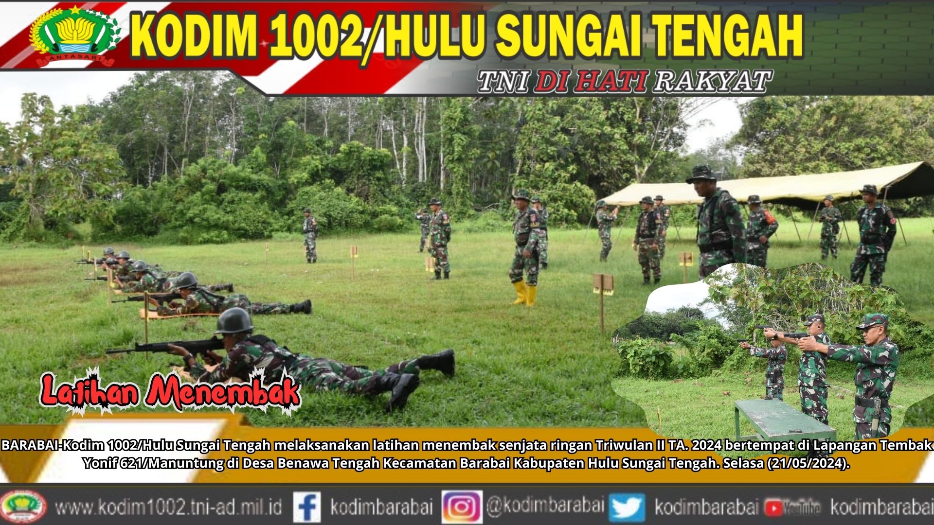 BARABAI-Kodim 1002/Hulu Sungai Tengah melaksanakan latihan menembak senjata ringan Triwulan II TA. 2024 bertempat di Lapangan Tembak Yonif 621/Manuntung di Desa Benawa Tengah Kecamatan