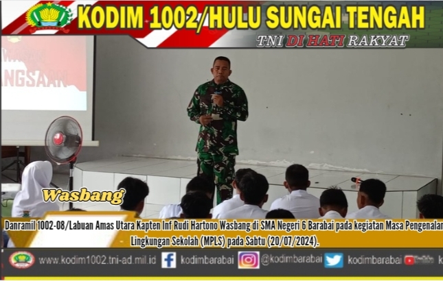BARABAI-Danramil 1002-08/Labuan Amas Utara Kapten Inf Rudi Hartono memberikan materi wawasan kebangsaan di SMA Negeri 6 Barabai pada kegiatan Masa Pengenalan Lingkungan Sekolah (MPLS)
