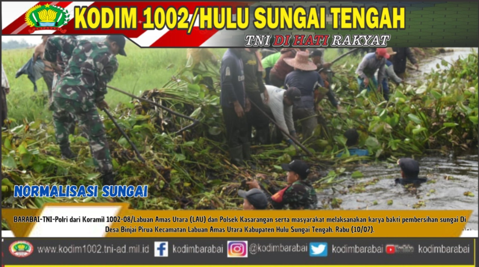 BARABAI-TNI-Polri dari Koramil 1002-08/Labuan Amas Utara (LAU) dan Polsek Kasarangan bersama masyarakat melaksanakan kegiatan pengabdian masyarakat pembersihan sungai di Desa Binjai Pirua, Kecamatan Labuan