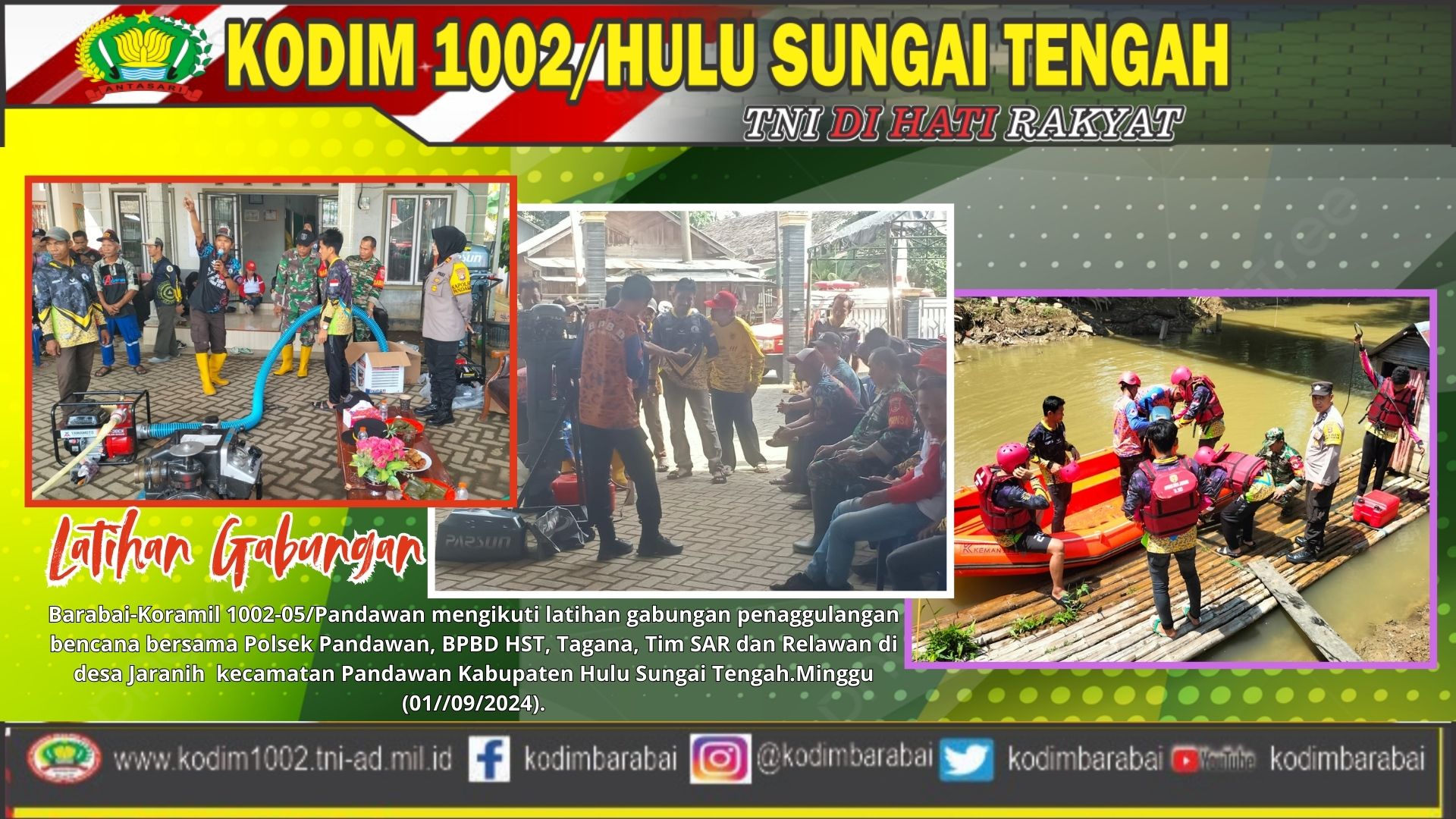Barabai-Koramil 1002-05/Pandawan mengikuti latihan gabungan penaggulangan bencana bersama Polsek Pandawan, BPBD HST, Tagana, Tim SAR dan Relawan di desa Jaranih dan Masiraan kecamatan Pandawan