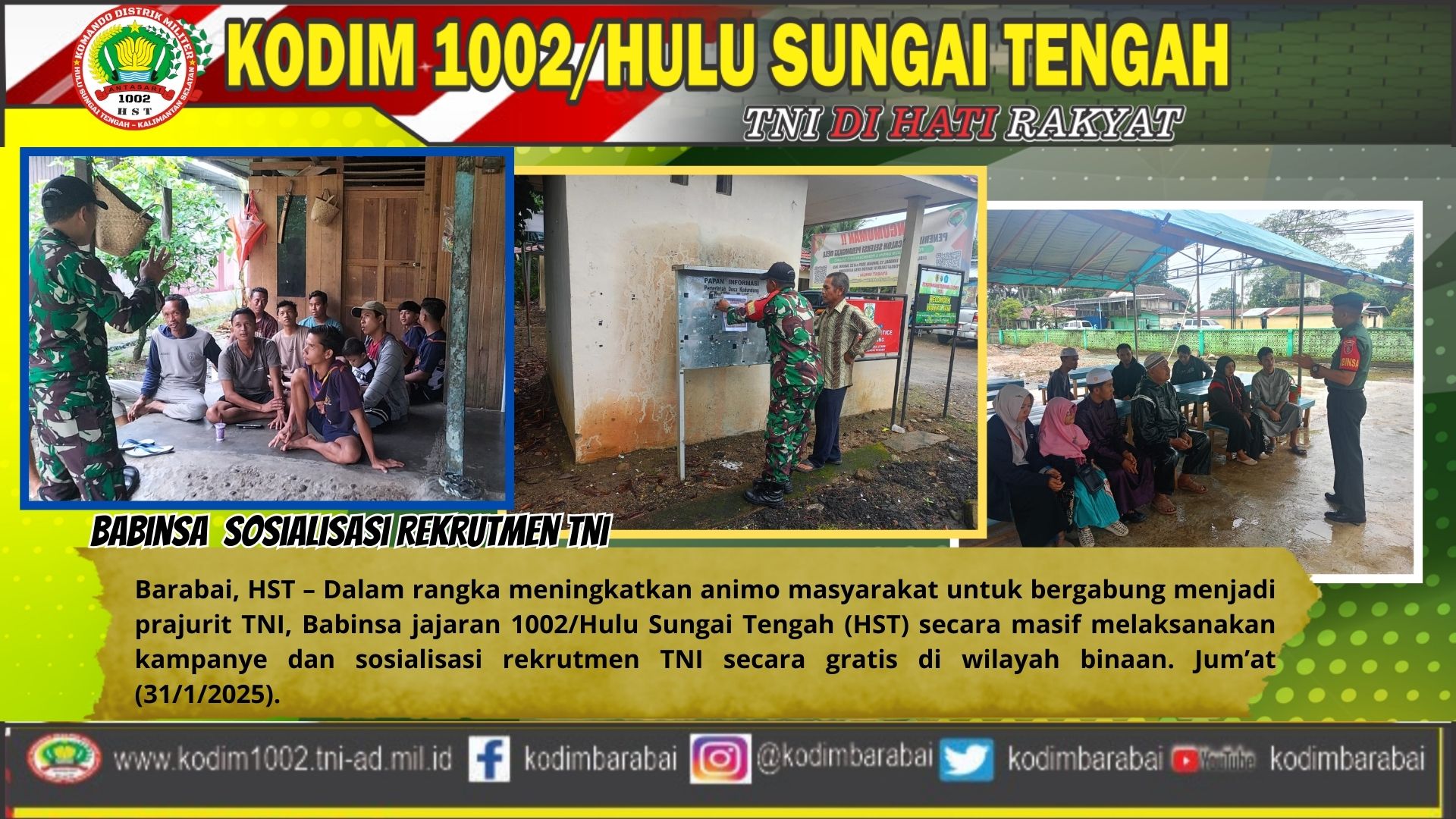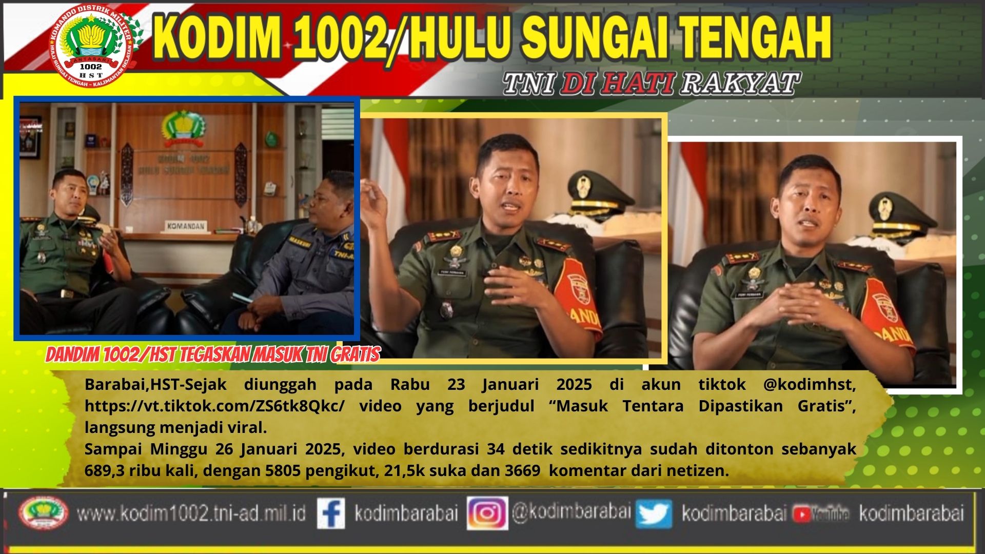 Barabai,HST-Sejak diunggah pada Rabu 23 Januari 2025 di akun tiktok @kodimhst, https://vt.tiktok.com/ZS6tk8Qkc/ video yang berjudul “Masuk Tentara Dipastikan Gratis”, langsung menjadi viral. Sampai Minggu