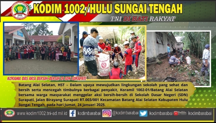 Batang Alai Selatan, HST – Dalam upaya mewujudkan lingkungan sekolah yang sehat dan bersih serta mencegah timbulnya berbagai penyakit, Koramil 1002-01/Batang Alai Selatan bersama
