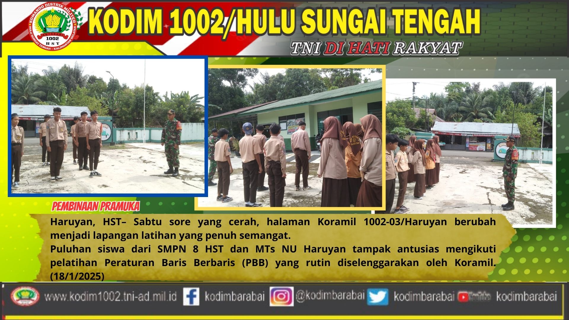Haruyan, HST– Sabtu sore yang cerah, halaman Koramil 1002-03/Haruyan berubah menjadi lapangan latihan yang penuh semangat. Puluhan siswa dari SMPN 8 HST dan MTs